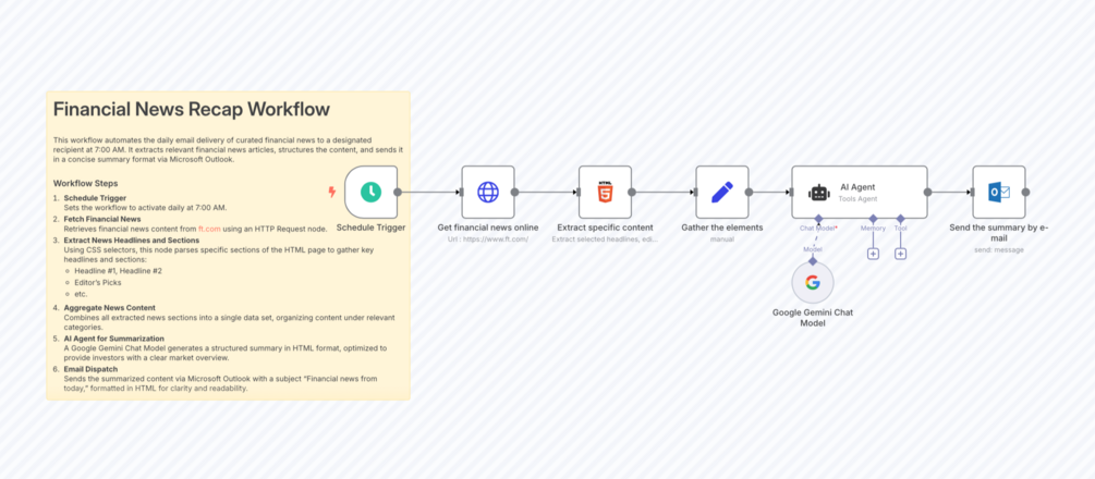 This workflow automates the process of collecting, organizing, and delivering a daily summary of financial news by following these key steps: