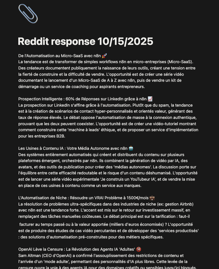 Tired of setting up automations or chasing trends yourself? 😩 Let me handle the heavy lifting! This managed membership runs the proven X & Reddit Trending Topics Finder workflow for you—customized to your niches. I'll scan up to 4 subreddits + 4 X keywords daily, deliver AI-powered insights (trends, debates, video ideas, monetization ops) 💡 straight to your Telegram, email, or storage (Notion, Google Sheets, whatever you prefer).